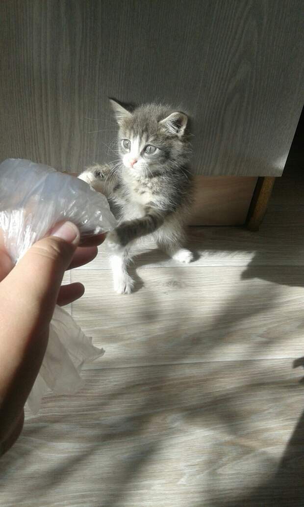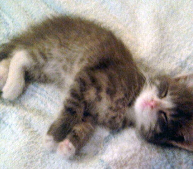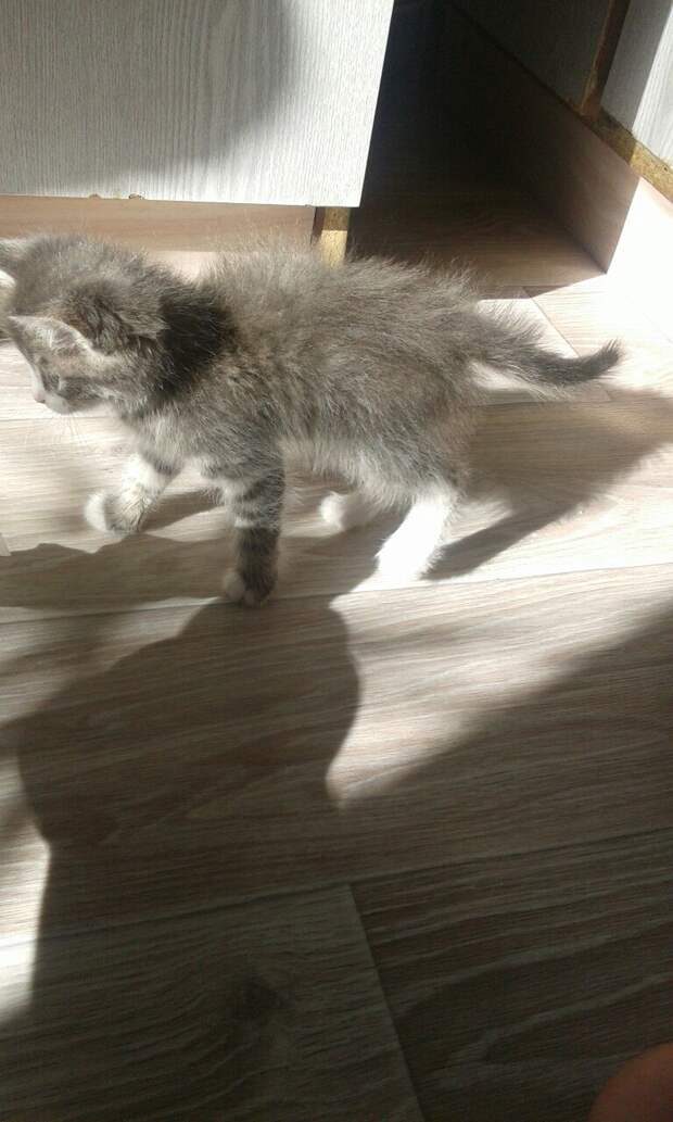 Мама быстро подбежала к котенку, смотрит на него и говорит: "все будет в порядке"! Вот такой мне был подарок на мой день рождения. Котенку было 3-4 недели.